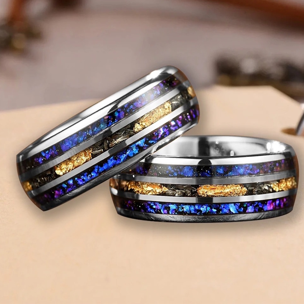 Dankzij het sterke wolfraam en de verfijnde afwerking met opaal en zilver blijven deze ringen jarenlang mooi. Het glanzende oppervlak straalt luxe en duurzaamheid uit een perfect symbool voor een blijvende verbintenis.